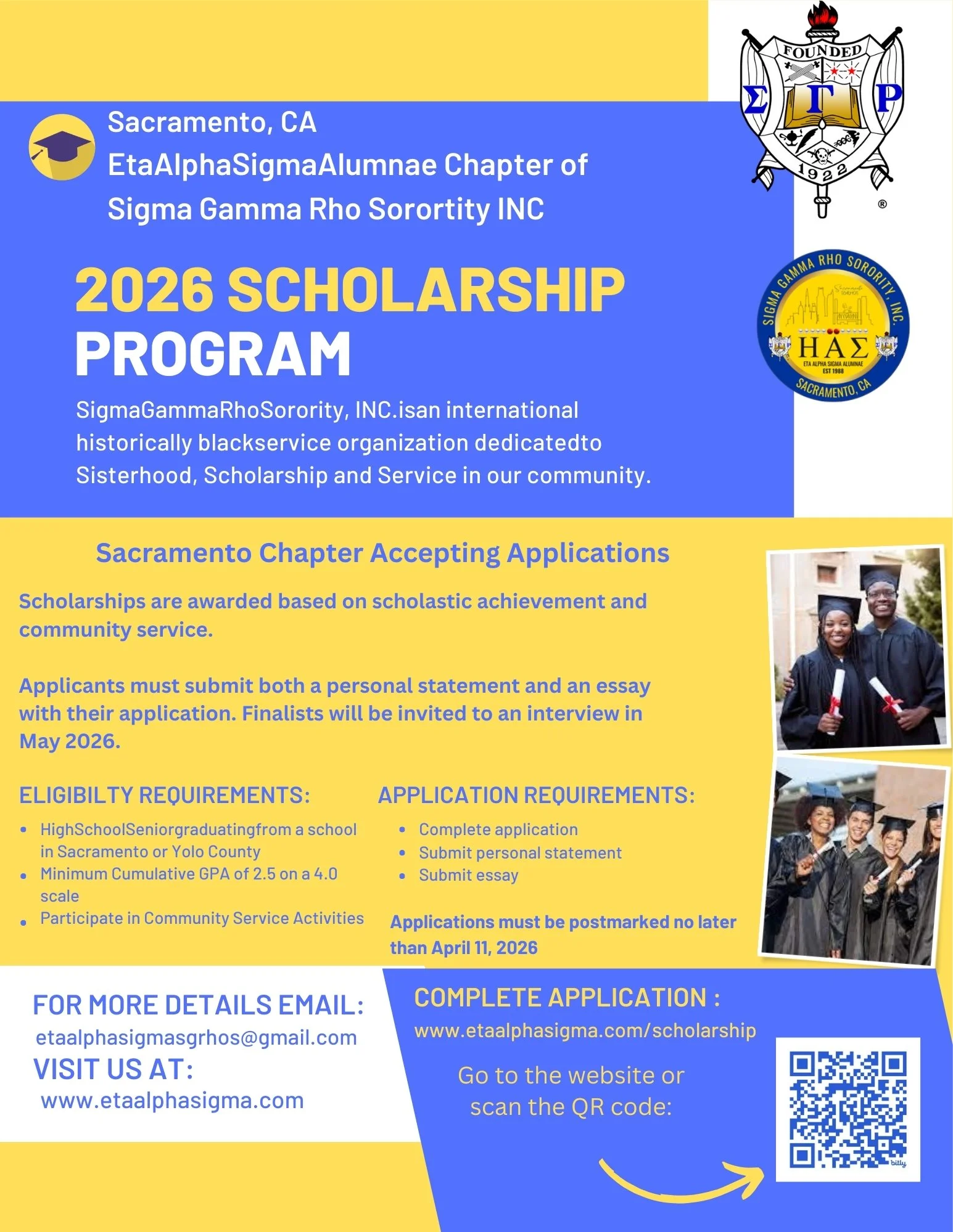 The Eta Alpha Sigma Chapter of Sigma Gamma Rho Sorority, Inc. is proud to offer its 2026 Scholarship to outstanding high school seniors in Sacramento and Yolo County who have demonstrated academic achievement and a commitment to community service.